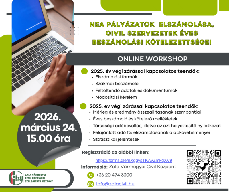 A Zala Vármegyei Civil Központ pénzügyi vezetője tart gyakorlati, naprakész tájékoztatót a civil szervezeteket érintő közelgő feladatokról és határidőkről.